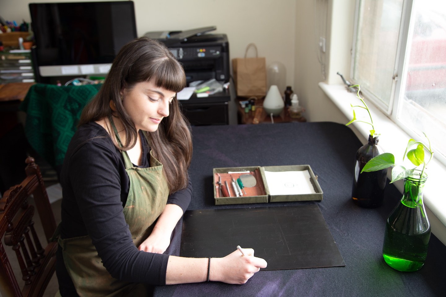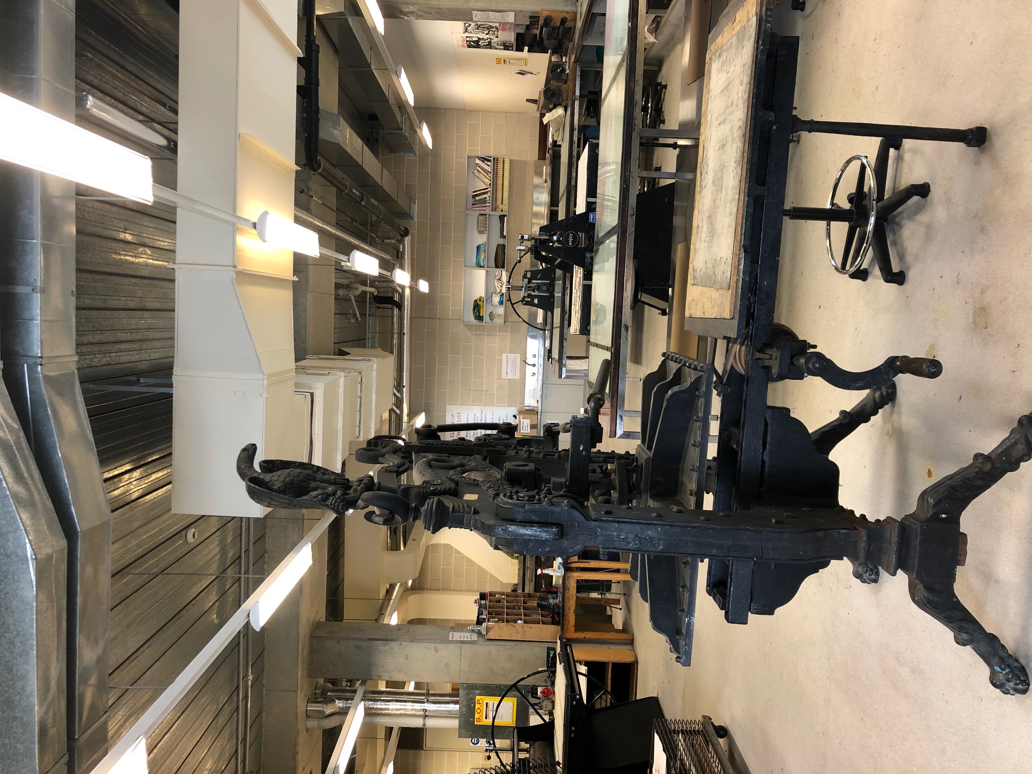 Hanah demonstrates printing on an MES etching press by Melbourne Etching Supplies in the University of South Australia’s printmaking studio. The department is home to five etching presses, a lithography press and a Columbian press. Two of these are historic items, one belonged to renown South Australian feminist printmaker Barbara Hanrahan, and the other to the Advertiser newspaper, established in 1858. Hanah gives us a tour of the studio and discusses these historic printing presses.